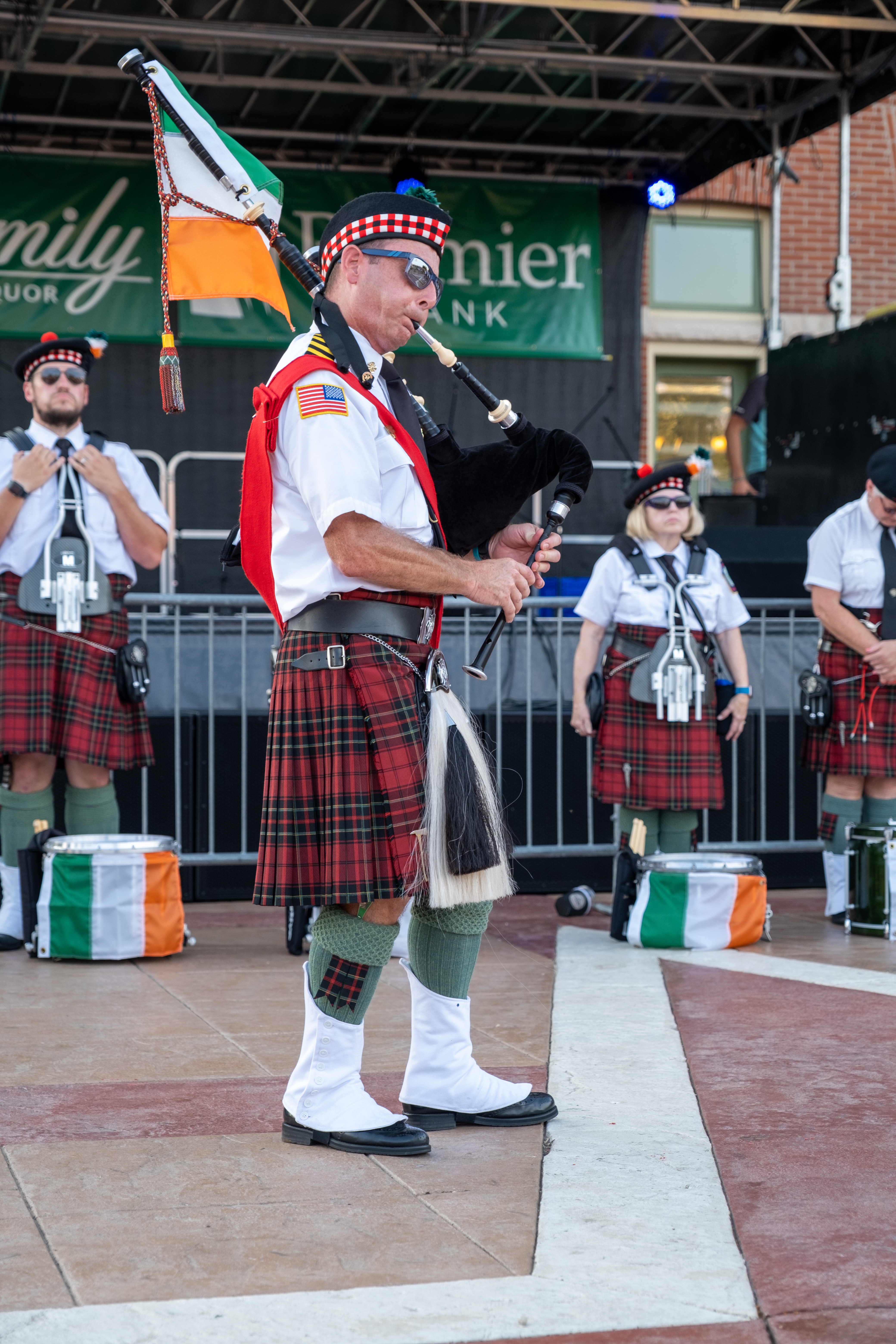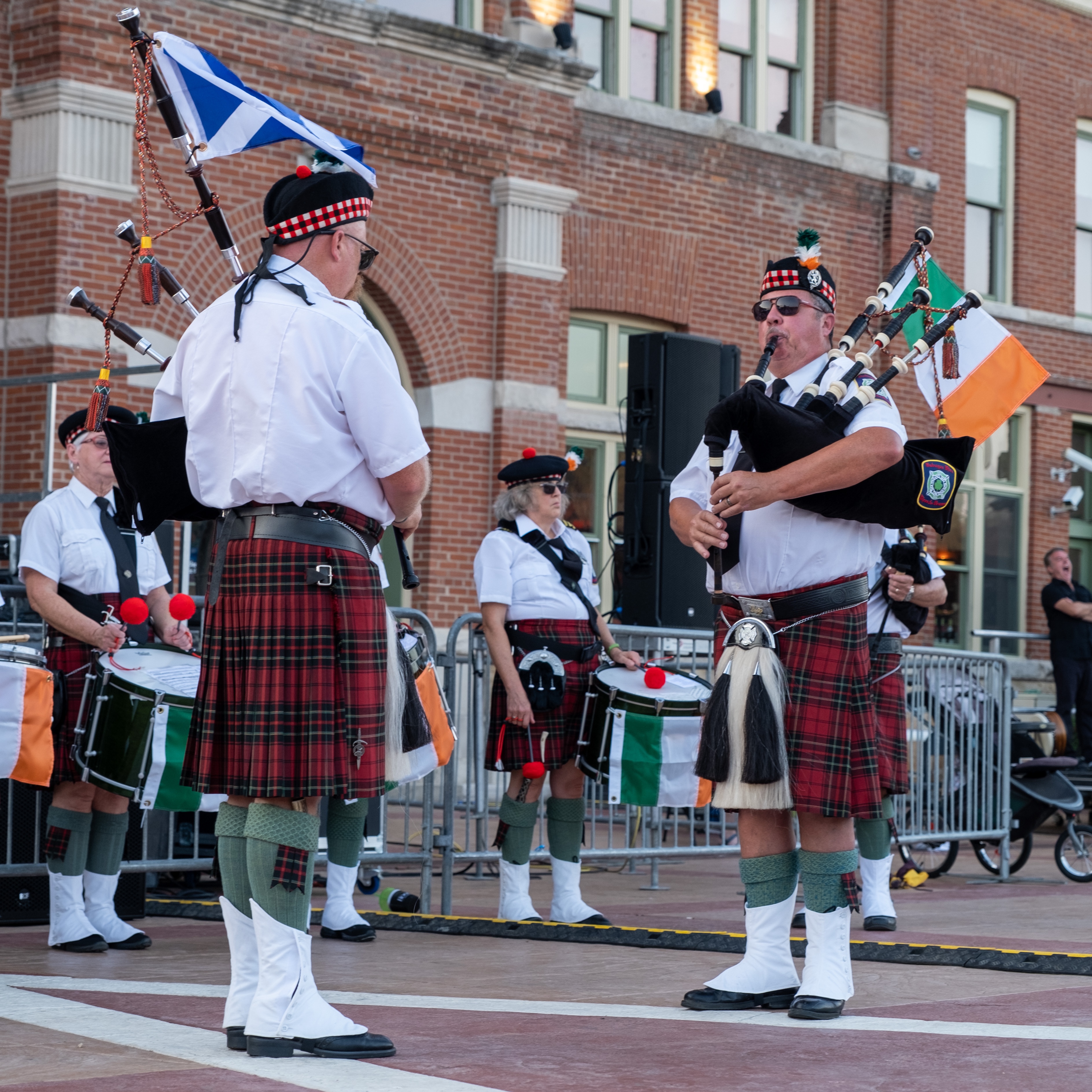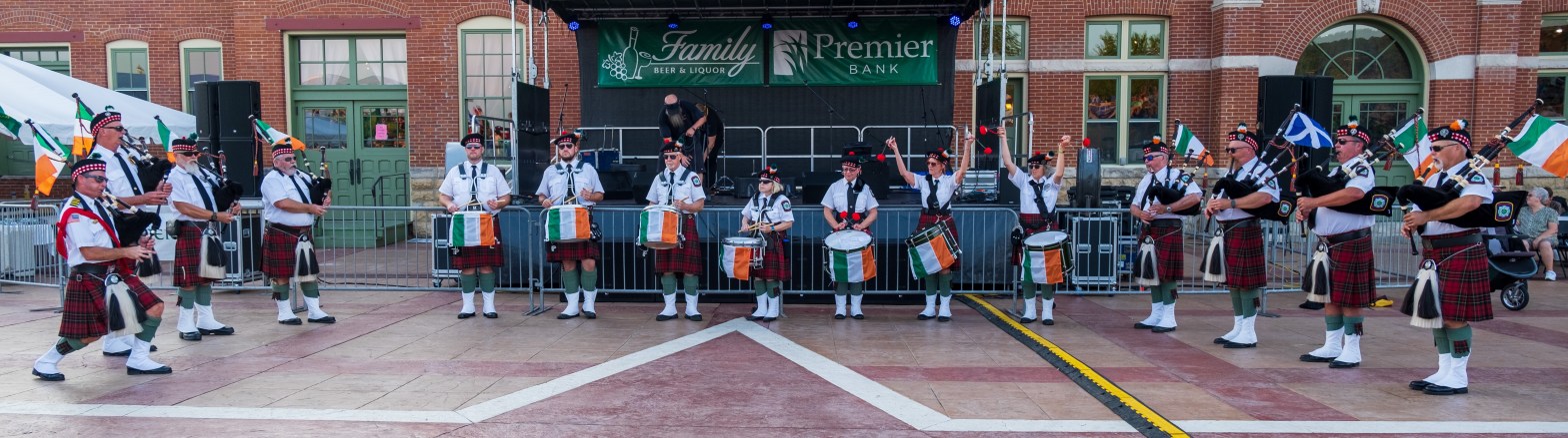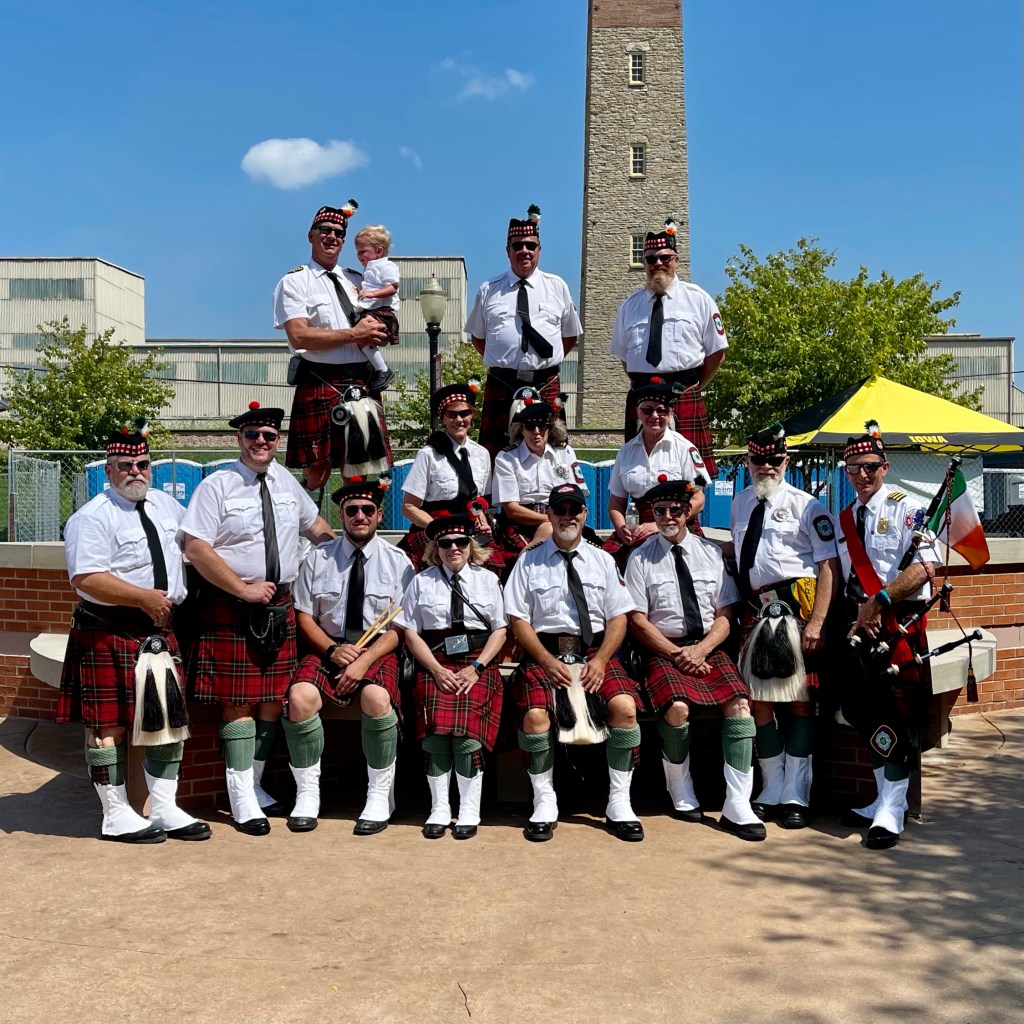 ‘Twas a fine day along the Mississippi River in Dubuque, Iowa, yesterday. After a year’s pandemic hiatus, the Hooley was back. The Dubuque Fire Pipes & Drums were proud to be part of a robust line-up. It was good to “celebrate living,” as MC and musician Ian Gould reminded all of us throughout the day.